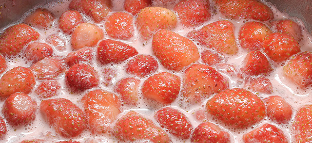 (1) いちごを洗ってへたを取り、小さめならそのまま、大きければ半分に切ってなべに入れる。